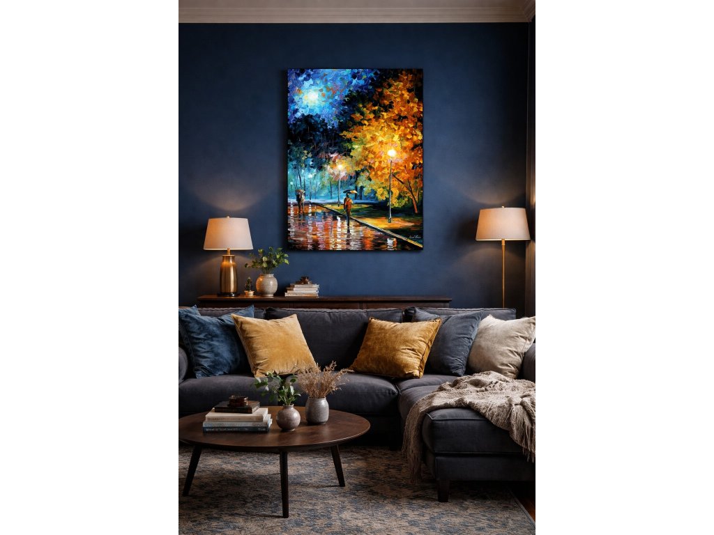 Tvorba Leonida Afremova zachycuje městské scenérie, deštivé ulice, parky, páry a osamělé postavy – motivy plné emocí, nostalgie a klidu. Každý obraz nese silnou atmosféru a je originálem s certifikátem pravosti.