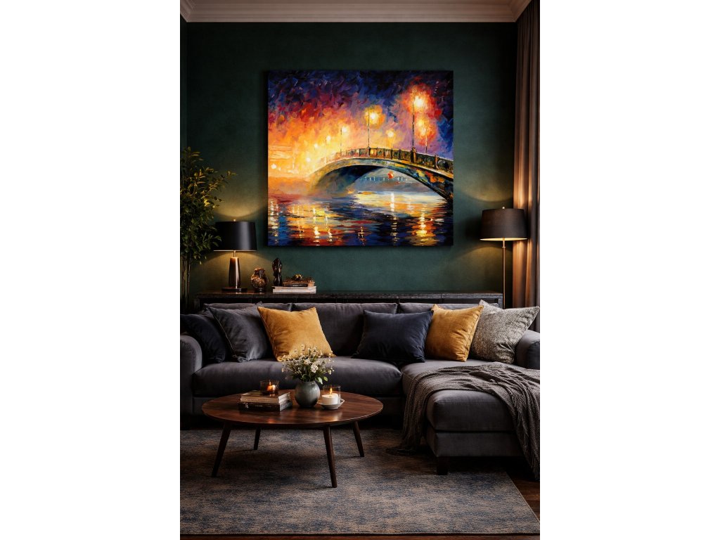 Oblouk mostu spojuje dva břehy stejně jako světlo spojuje tmu s barvou. Lampy rozsvěcují noc a jejich odrazy se rozpíjejí na hladině vody v typickém Afremovově rukopisu.