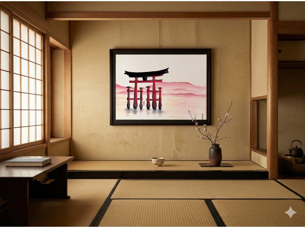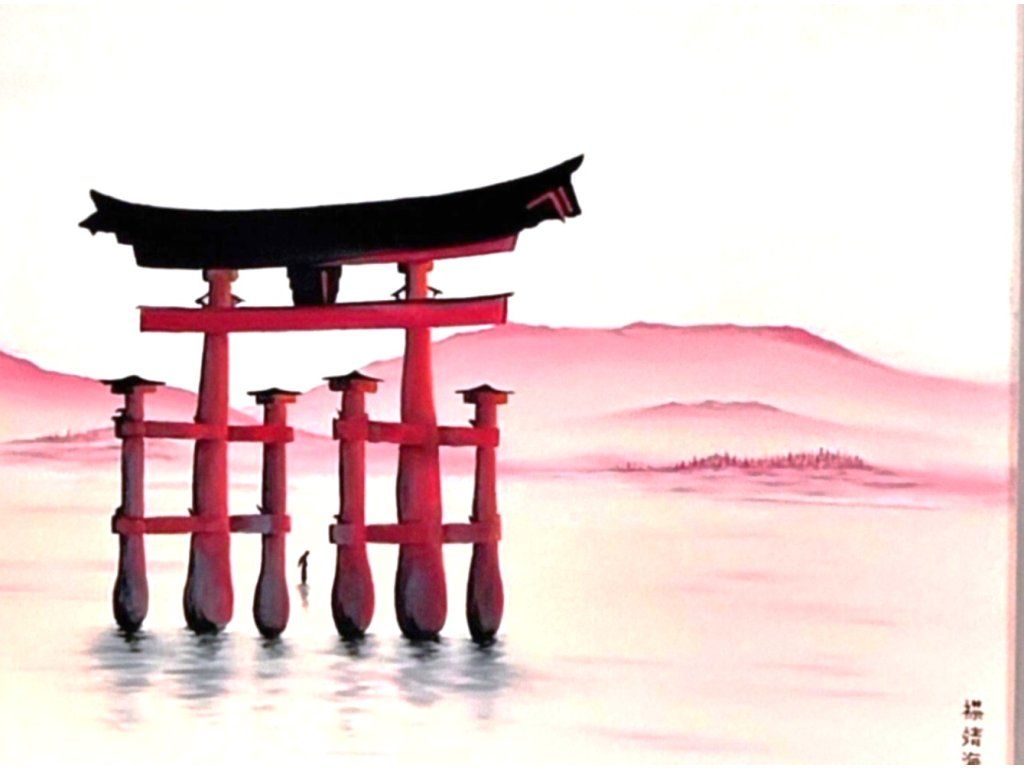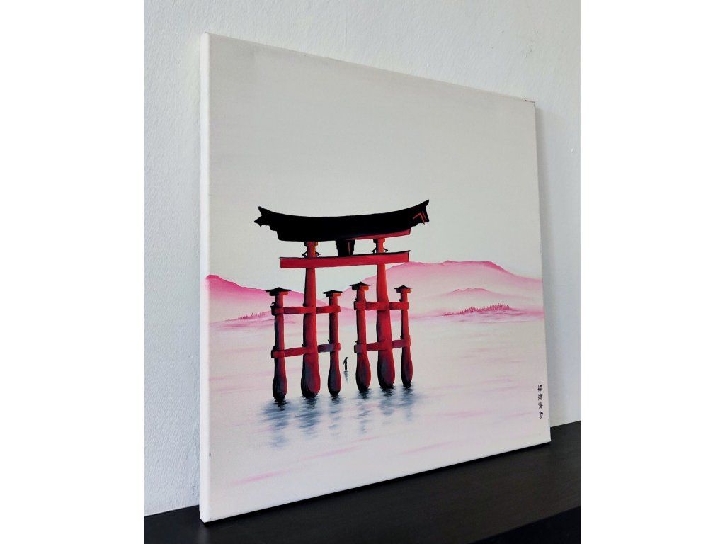 Autorská olejomalba Jiřího Eliáše zachycuje jednu z nejikoničtějších scenérií Japonska – torii bránu svatyně Icukušima, která se zdánlivě vznáší na hladině vody.