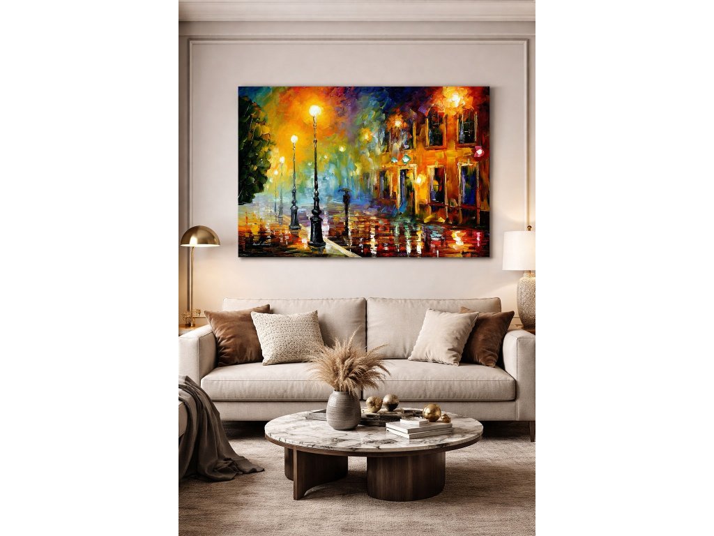 Tvorba Leonida Afremova zachycuje městské scenérie, deštivé ulice, parky, páry a osamělé postavy – motivy plné emocí, nostalgie a klidu. Každý obraz nese silnou atmosféru a je originálem s certifikátem pravosti.